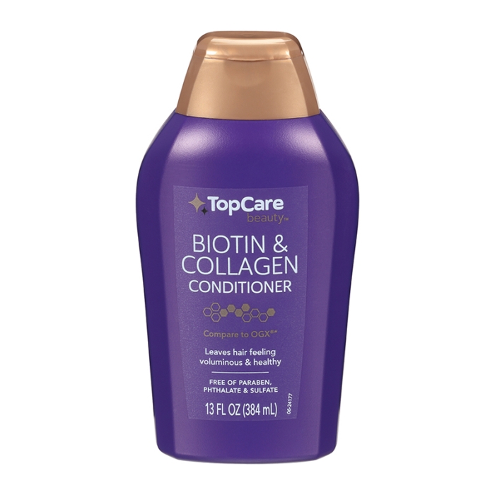 Acondicionador con biotina y colágeno de Top Care. Deja el cabello sintiéndose voluminoso y saludable.